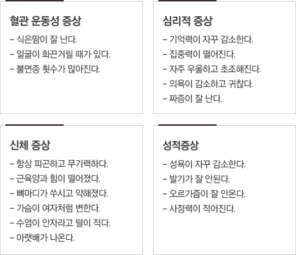 남성갱년기는 여러 가지 증상을 일으키게 됩니다. 전신증상으로 피로감, 무감정, 소화장애, 식욕부진, 발한, 구갈 등을 비롯하여 순환기 장애로 현기증, 안면홍조, 열감, 심계항진, 관절통, 혈압상승 등이 나타나고 신경증상으로 신경과민, 기억력 감퇴, 우울증, 정신집중력 상실, 불면증, 강박관념, 두통, 하복통, 요통, 이명 등이 나타납니다.